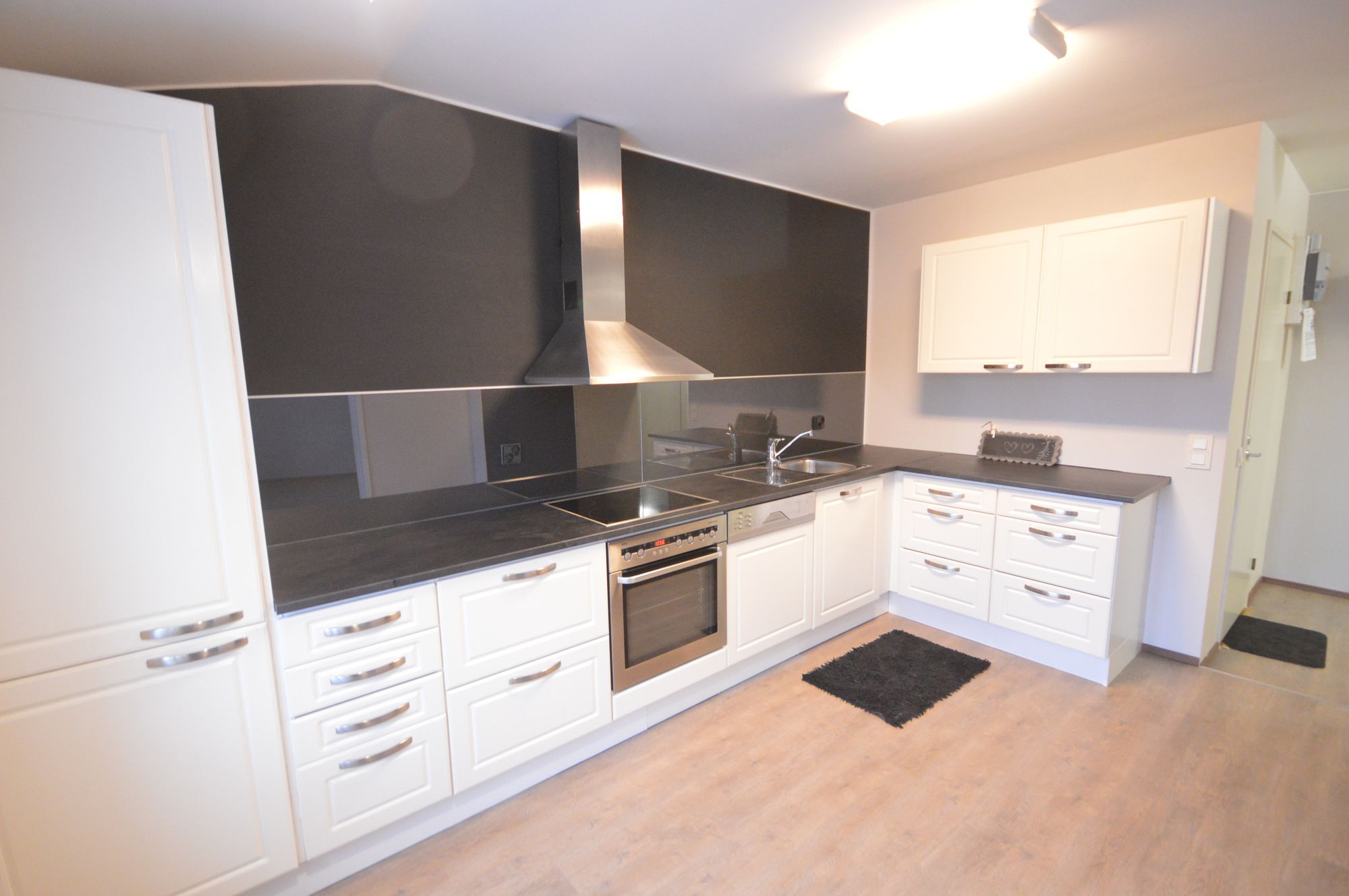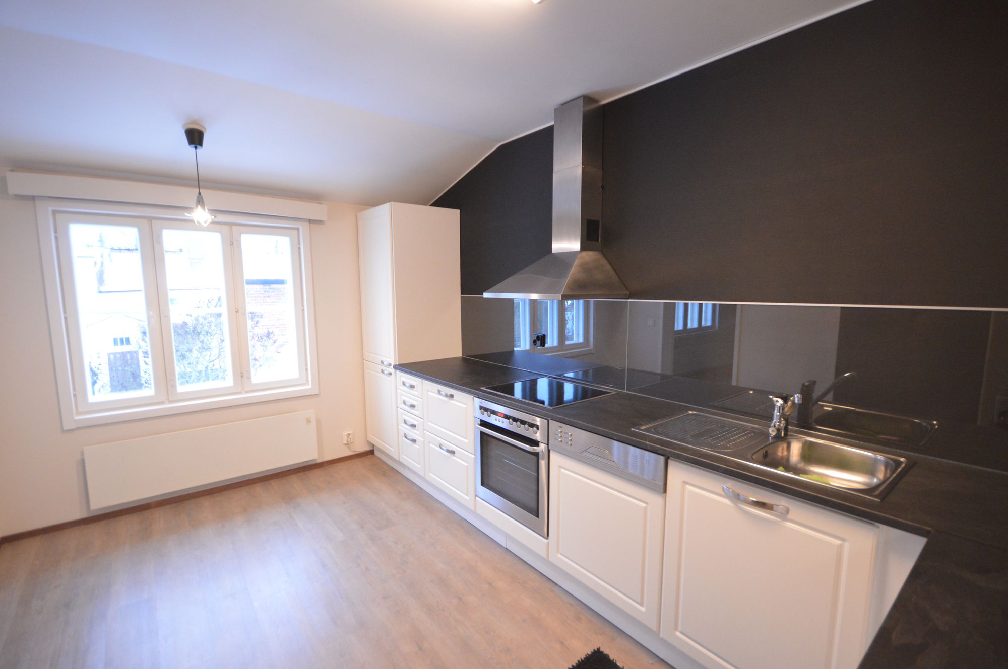 Huoneiston lattioissa on helppohoitoinen vinyyli. Tilava ja uudistettu keittiö hurmaa vaaleilla kaapistoillaan ja modernilla ilmeellään. Keittiön varusteluun kuuluvat liesi, liesituuletin, astianpesukone sekä jääkaappipakastin. Keittiön ilmettä ryhdittää tyylikäs musta tehosteseinä liesituulettimen takana sekä tummat työtasot. Avointa ja valoisaa tunnelmaa lisäävät kaapittomuus tehosteseinällä sekä suuri ikkuna rauhalliselle sisäpihalle.